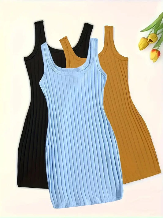 3 piezas de vestido de tirantes de punto acanalado sólido